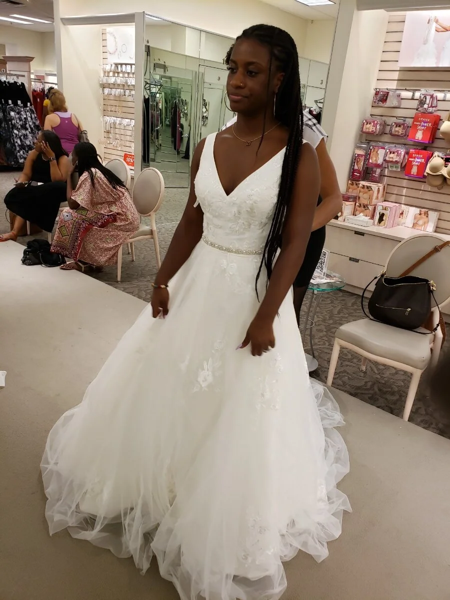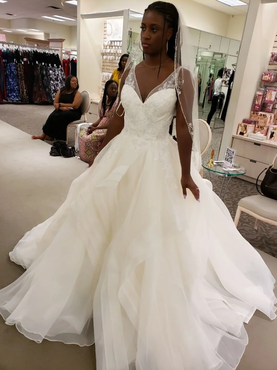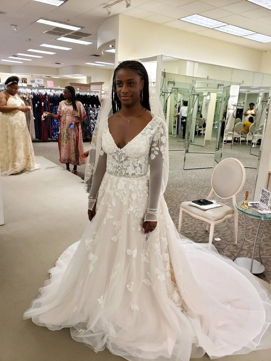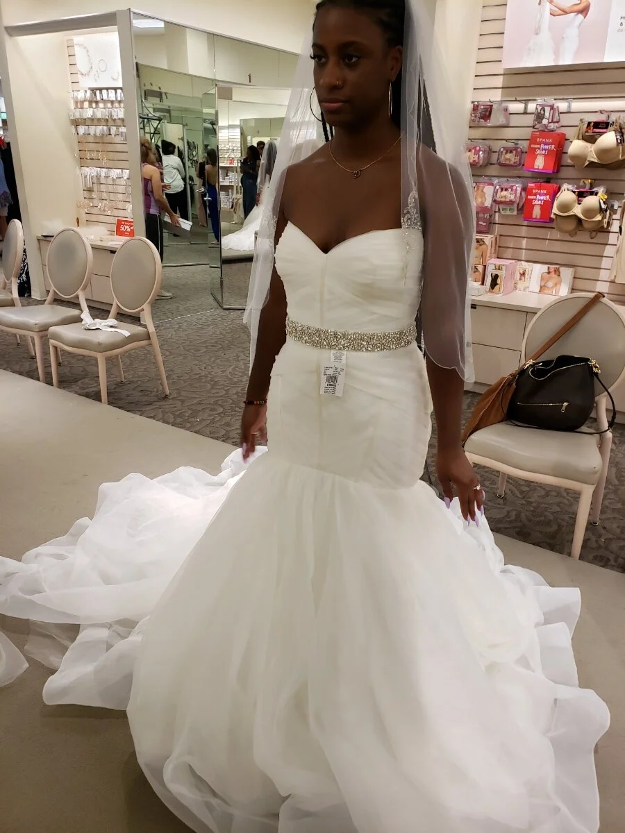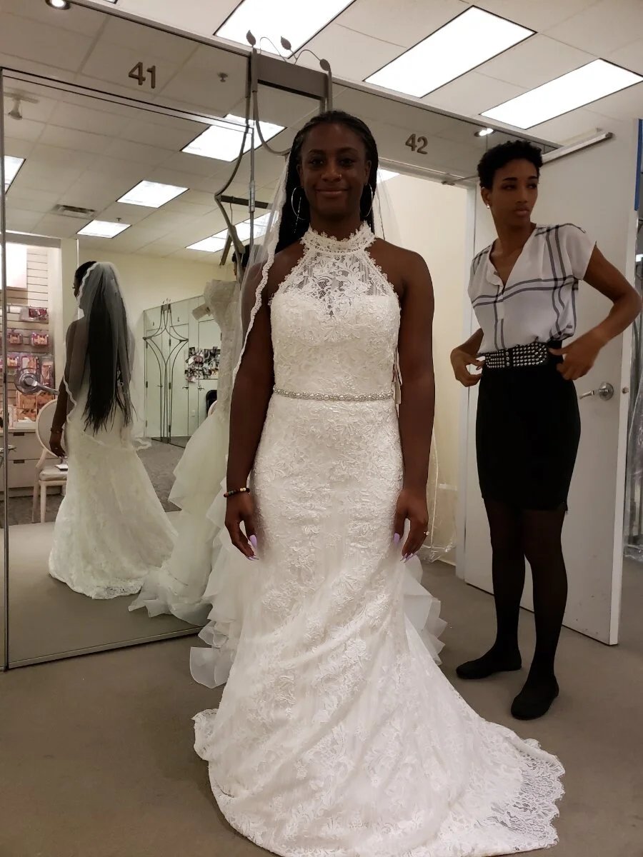 Not even trying to shade David’s Bridal, but just based on what my envisioned wedding gown looked like it wasn’t going to be found at David’s Bridal. However, I was freshly engaged and extremely eager to get my ass in somebody’s wedding dress so this was the soonest appointment I could get. The location that I visited had a great selection of dresses, the service was great, and they’re also very affordable. I hate that I didn’t keep note of the designers and the costs of the dresses, but in my defense I didn’t plan on buying any of them so I technically didn’t need that information.