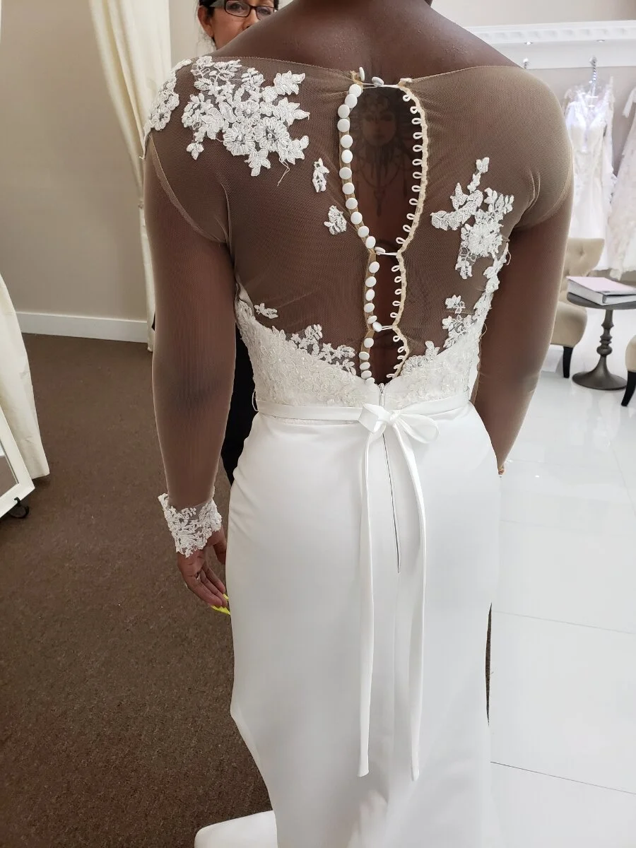 I can honestly say that this is the only dress other than the one that I bought that I actually loved. The drama, the detail … it’s doing everything for me! It also has a detachable train which I thought was pretty amazing. The only thing that killed me was the illusion neckline. I do not like the way it looks on me at all.