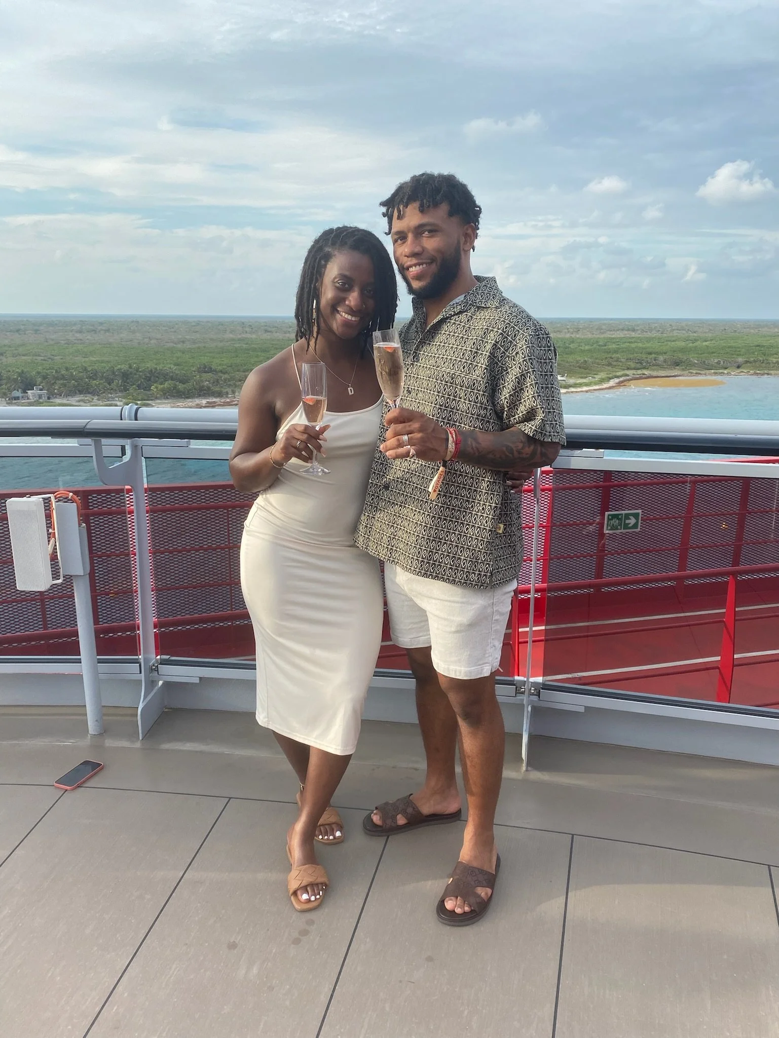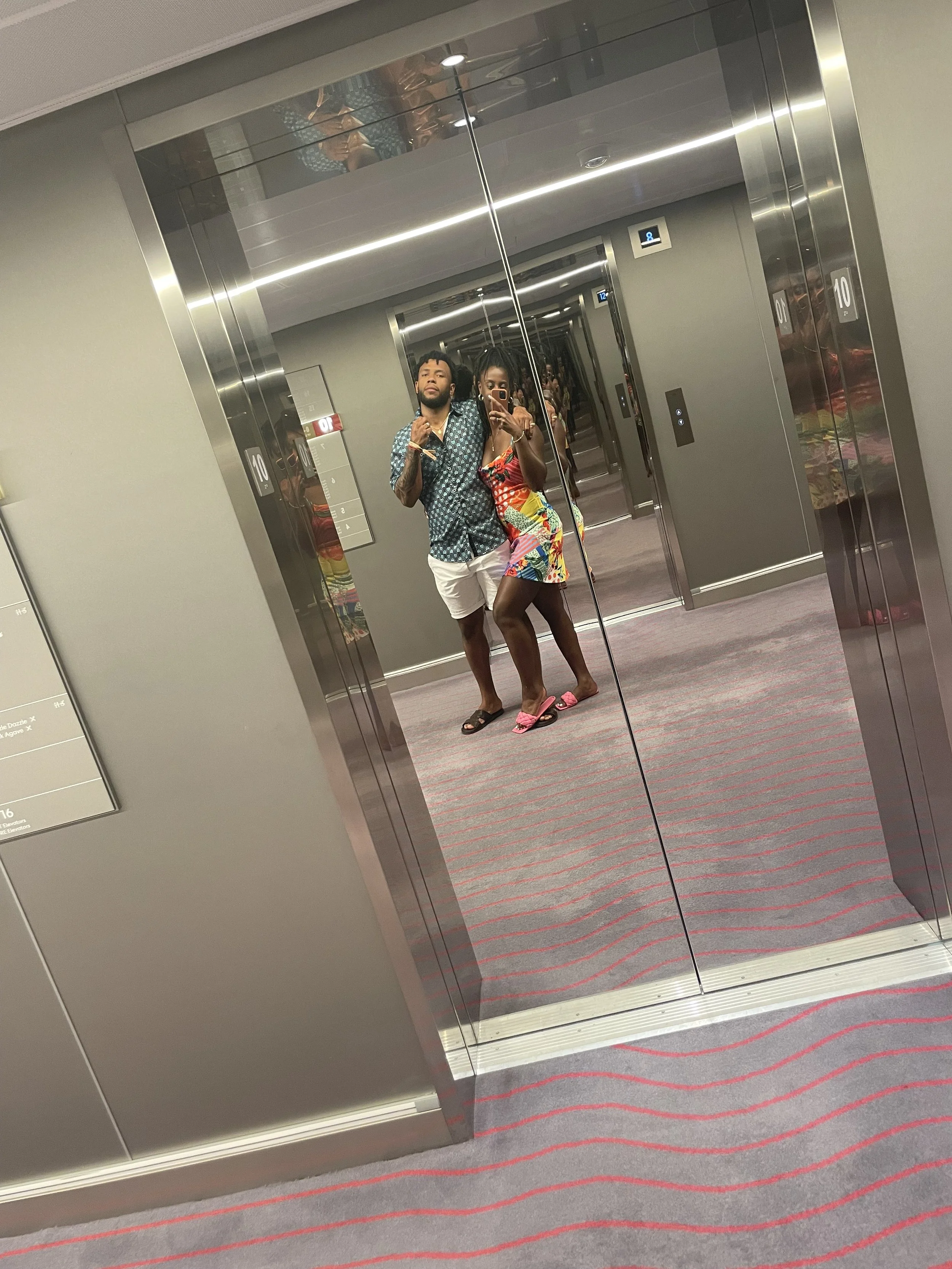 Scarlet Night is what I would say was the night of partying on the ship. Everyone is encouraged to wear red, so we changed before the festivities started. I’m wearing a two-piece set that I bought a few years back from BooHoo, and Deion is wearing the same pair of shorts and a red collared shirt from Amazon. There was a pool party, different kinds of music being played in different parts of the ship, and then there was the after party at the club. It was great time.