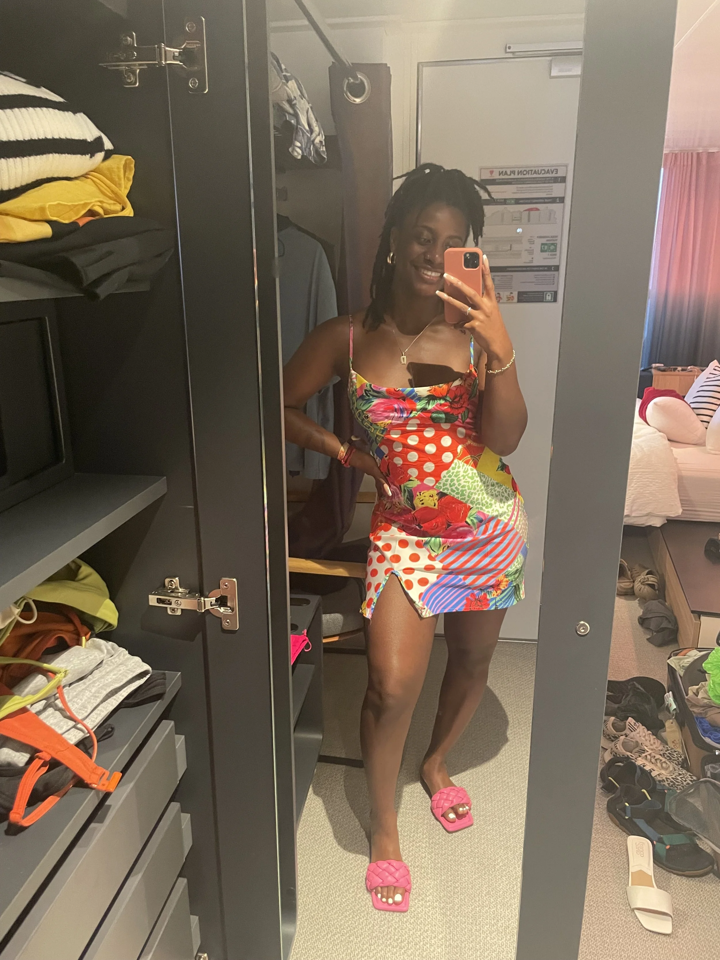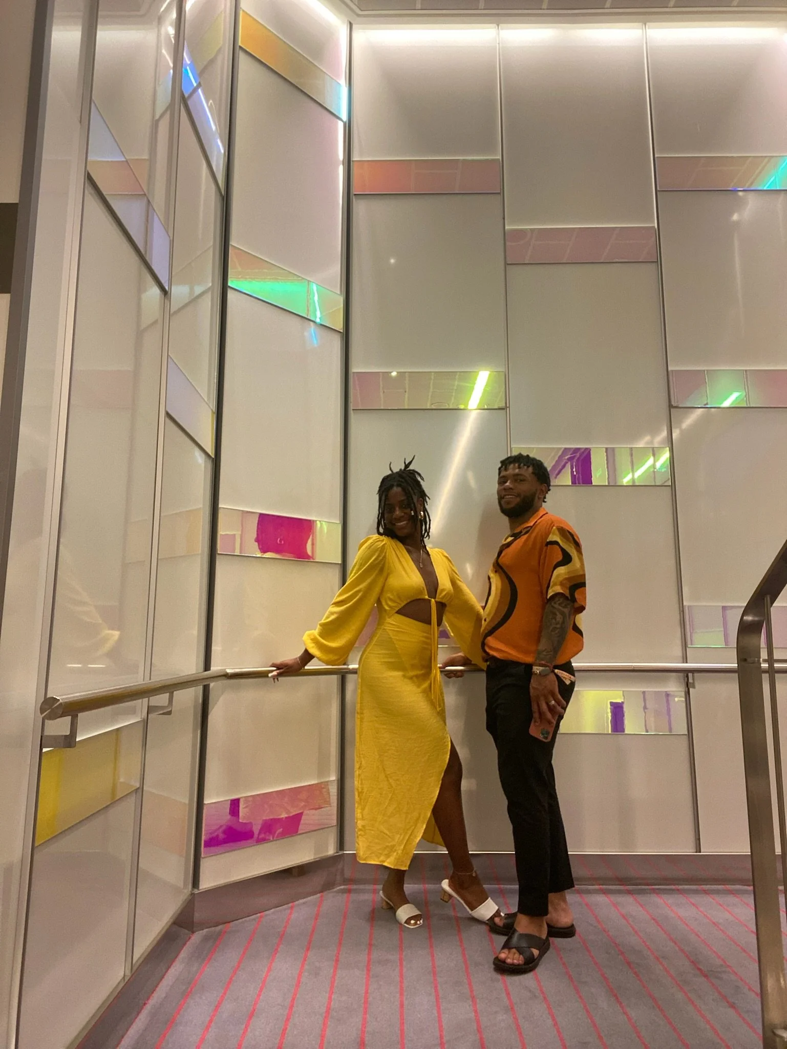 That night, there was a pajama party on the ship that I wore this set from NastyGal to. I forgot to get a picture of Deion’s pajamas, but it was a dark green satin set with shorts and a button up shirt from Amazon. Y’all know I’m an Amazon Associate, so all qualifying purchases made through the paid link above will earn me commission. Going forward, all Amazon links in this post are commission- earning.