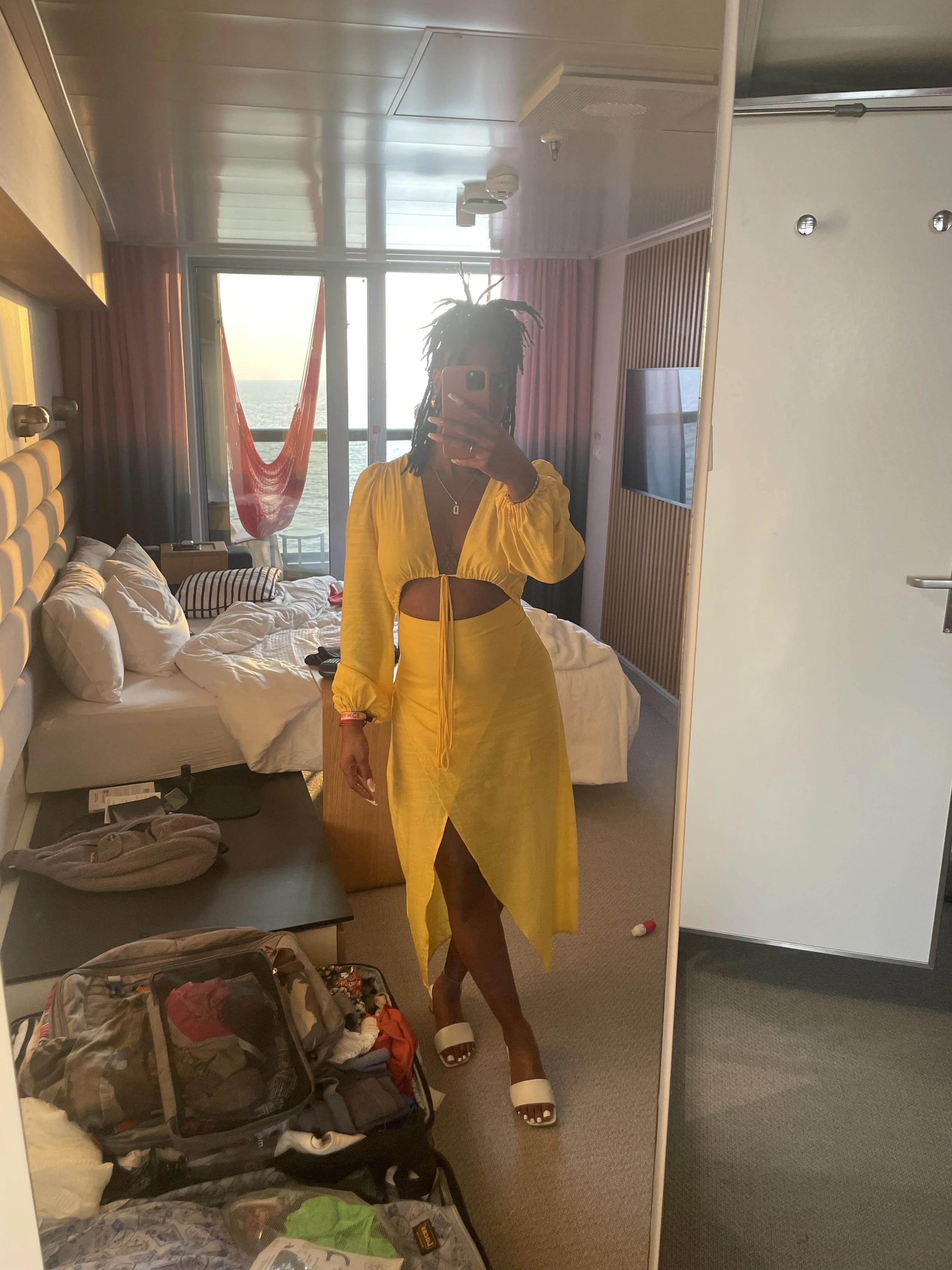 Day 2 was our anniversary. We started the day with a yoga class, got breakfast, and went to the spa for a few hours. Later that day, we ate dinner at Extra Virgin, which is the Italian restaurant on the ship. I purchased my dress from ShowPo and low-heeled sandals from Amazon. Deion’s shirt is from ASOS, pants from Express, and sandals are also from Amazon. After dinner, we enjoyed a bottle of champagne on the top deck, and I believe ventured to the club later on that night.