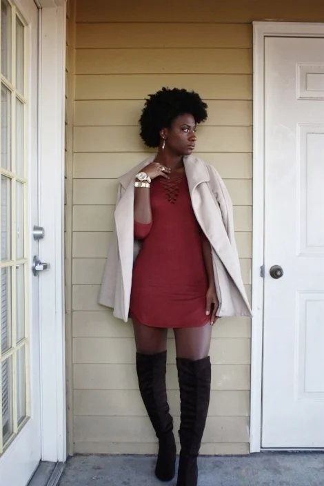 Now for the fun part. My "lavishly on a budget" outfit was worn for a birthday dinner I attended earlier this month. It was at this cute little restaurant in downtown Greenville that for the life of me I can't remember the name of. The food was mediocre so I guess it's best I don't include the name of it anyways. But the restaurant was nice enough for me to put together a foxy outfit so I'm really not going to sit here and complain. The dress I'm wearing came from Bealls Outlet and I'm pretty sure it was like 12 or 13 dollars max. It's a reddish-burgundy color with lace up detail under the neckline and a dolphin hem (my fav). I really wanted a trench coat for this look, so I had to work with what I currently have which is what I'd like to call a semi-trench coat. It doesn't 'really match the "typical" trench coat lengths which is how I came up with the name; it's like half way there to being a trench coat but it's still not close enough. But obviously it still worked with what I was going for on this occasion. It came with a belt which you guys can see in the additional photos in my lookbook. I got it as a Christmas gift in 2015 so unfortunately I can't tell y'all how much it is, but what I can tell you is it's from Forever 21. It's actually really itchy on the inside but beauty is pain and discomfort my friends. Lastly, my boots, which are also my favorite part of this look, are from Rue21. I got lucky and got them apart of a buy one, get one free sale so instead of buying two pairs of boots for $80 I got both of them for $20 each. What I loved about this particular pair is the lace detail on the back, which you guys can also see in my lookbook. If it isn't noticeable in the photos, the boots are a suede material and a very deep brown color. Despite my dedication to heels being four or more inches, the 3-inch chunky heel on these boots made me love them even more. They're super comfortable and easy to walk in; it literally feels like I'm walking on memory foam padding. Chunky heels are one of the only exceptions I make to having a heel that is below four inches. I will preach about this until I can't anymore; if you aren't in a professional setting then you have no business wearing a baby heel. It personally pains me to see such a disgrace. As I'm typing this, it's being said jokingly in my head, so please don't come for my throat. It's just something about a high arch in a pair of heels that does something to me. I love my ankle-breakers.