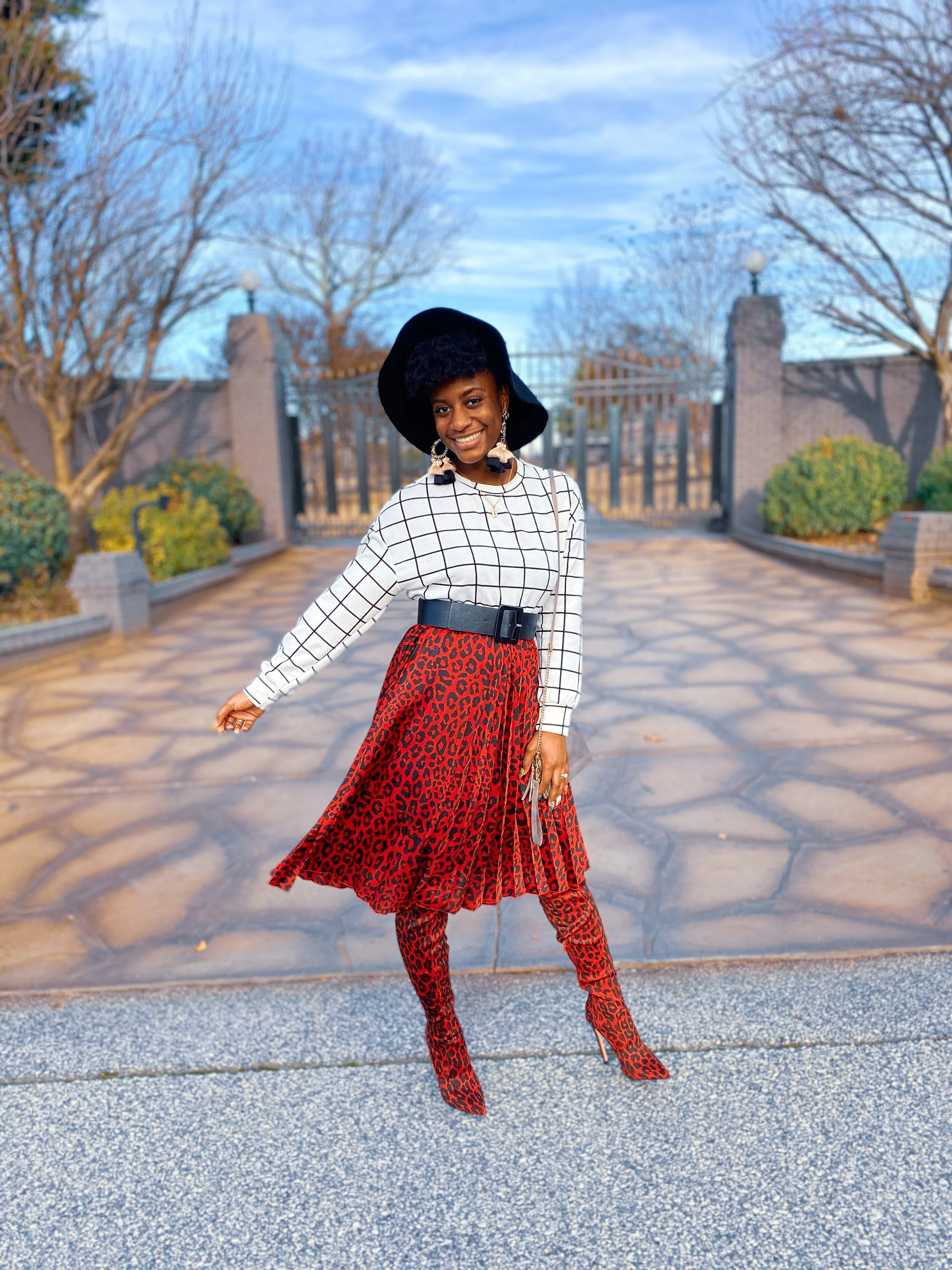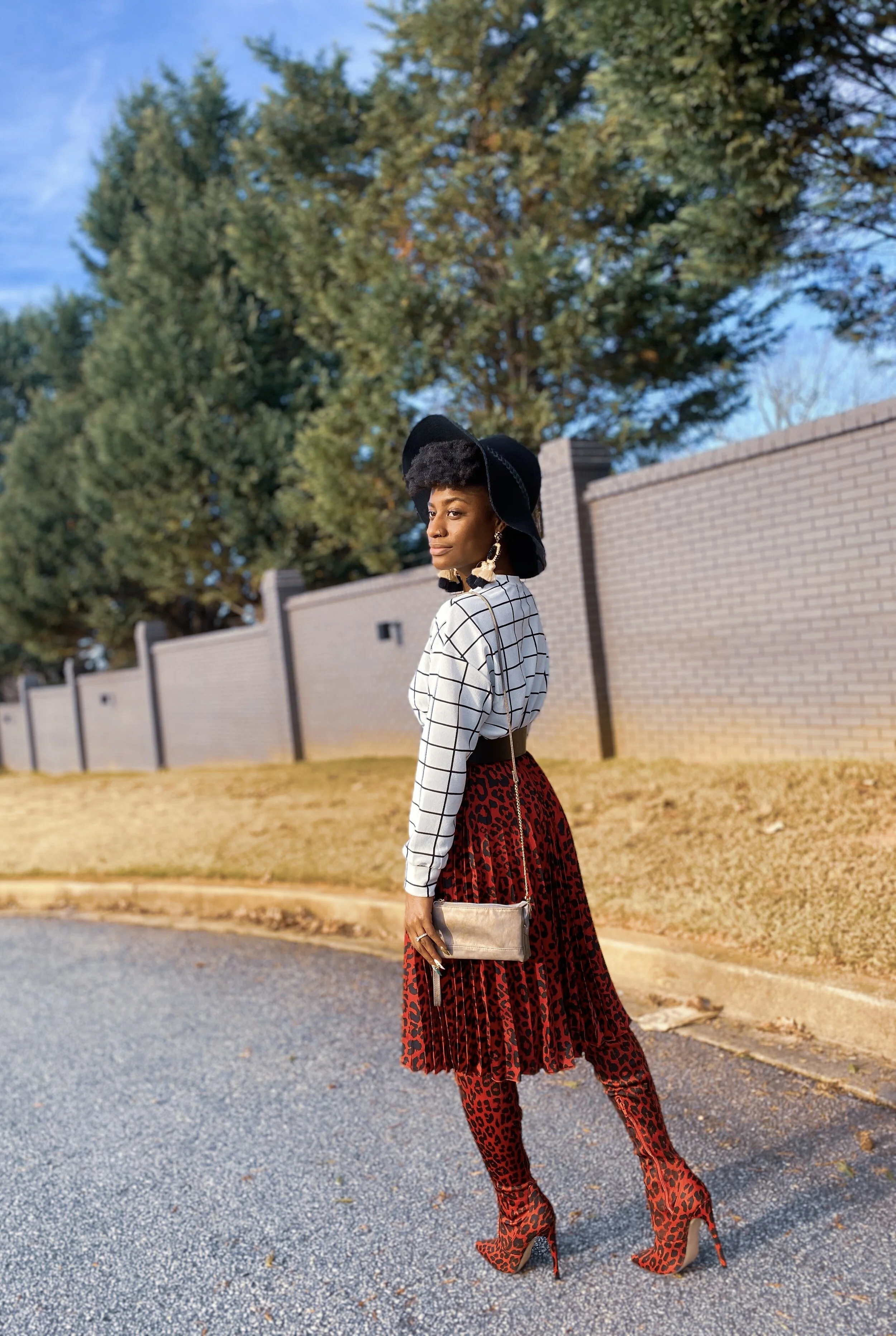 Present day me is all in, and it’s not solely because I was just so in awe over how gorgeous these boots were. It was the fact that I had plans of buying a red leopard print midi skirt (JCPenney / $19, originally $60) that would match the boots PERFECTLY. I’m talking cut from the same fabric kind of perfect. I hadn’t thought about how I’d style the skirt just yet, but I knew I wasn’t going for a matchy-matchy kind of look. Because of that, black boots and a black top weren't going to cut it. I needed something to lighten up the skirt, offset the print just a bit. So I feel as though this grid print top (Shein, $8) would’ve made its way into this look regardless; if not this exact one, it would’ve been something very similar. Actually, now that I think about it, I originally was on the hunt for an oversized cowl neck sweater. I just couldn’t find THE ONE. I was waiting for that “oh yeah, that’s the one!” feeling like I had with the boots but nothing did it for me. I just ended up doing a broad ass search for printed tops and sweaters and chose something. That’s REALLY how the grid print came about.