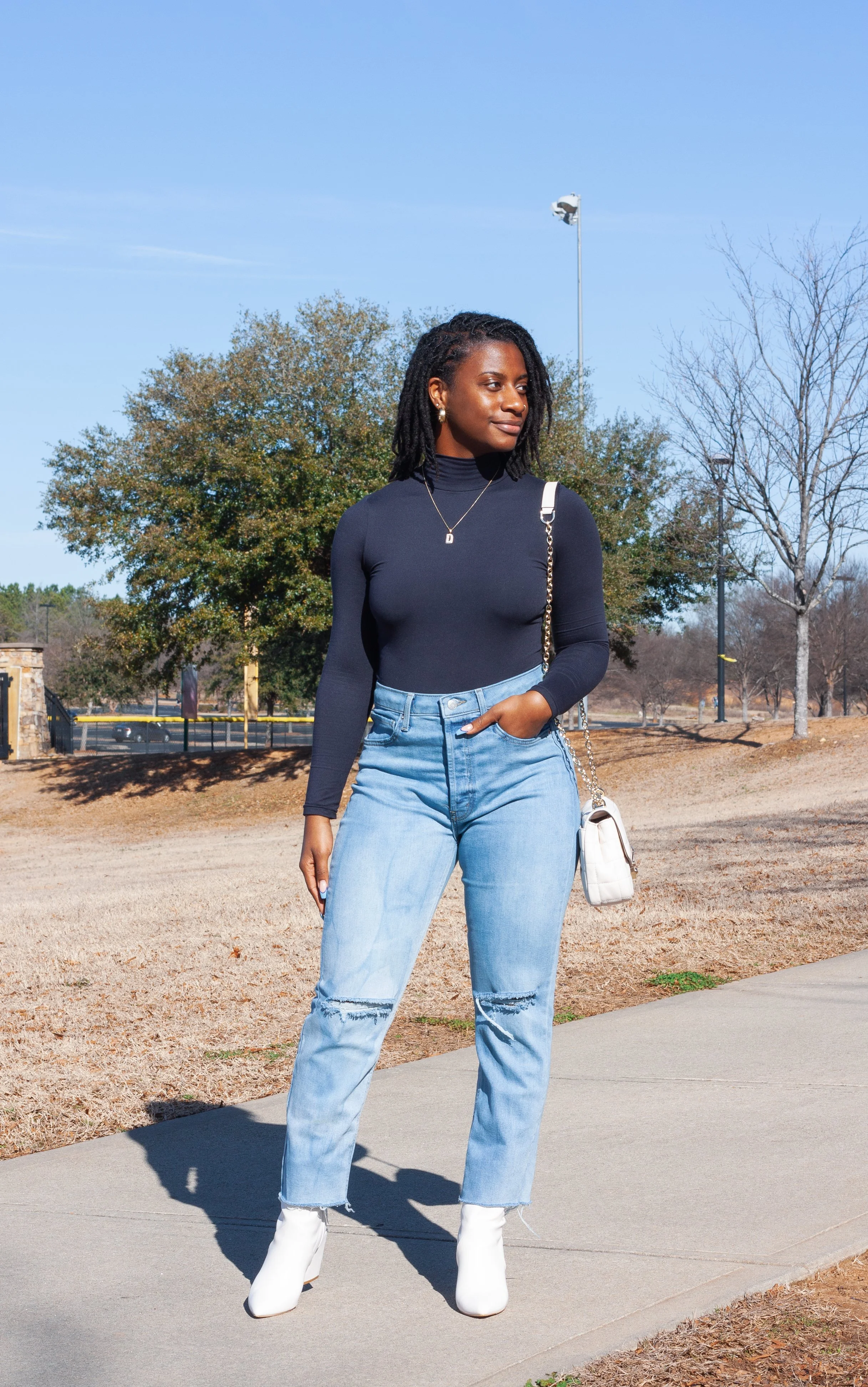 If you haven’t guessed it by now, the common denominator in the four looks below is the black turtleneck bodysuit. Yes, you read that right. It’s a bodysuit, so it stays smooth, and you obviously don’t have to worry about it randomly coming untucked at an inconvenient time. I purchased it from Amazon, as I do just about everything else, and since I’m an associate, I do earn from qualifying purchases that are made through the paid link above.