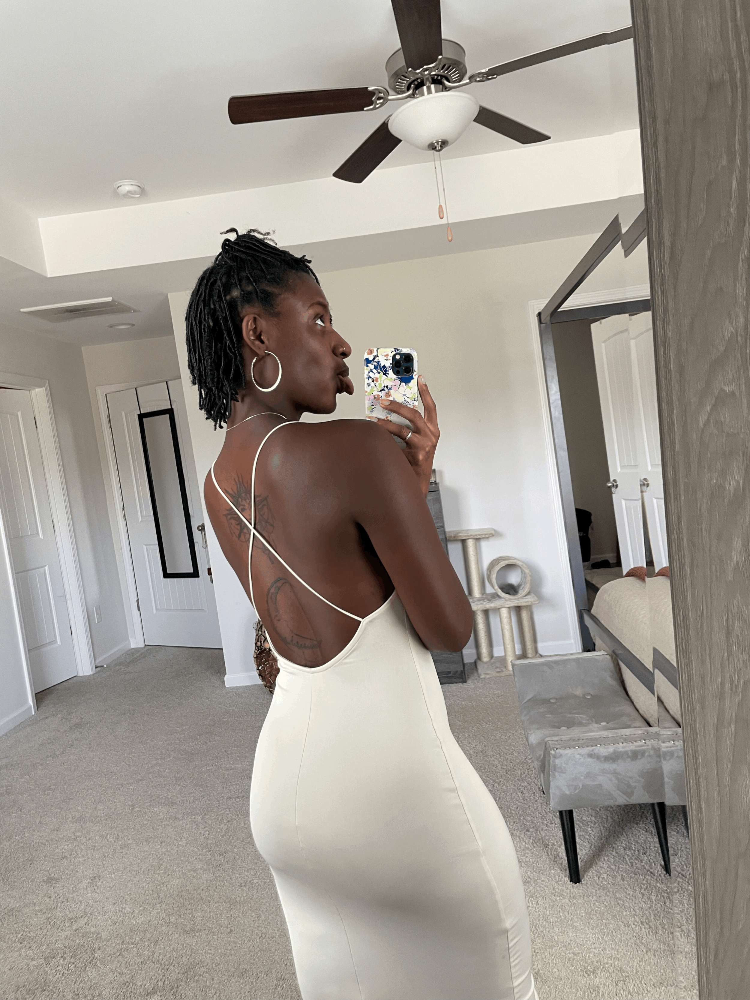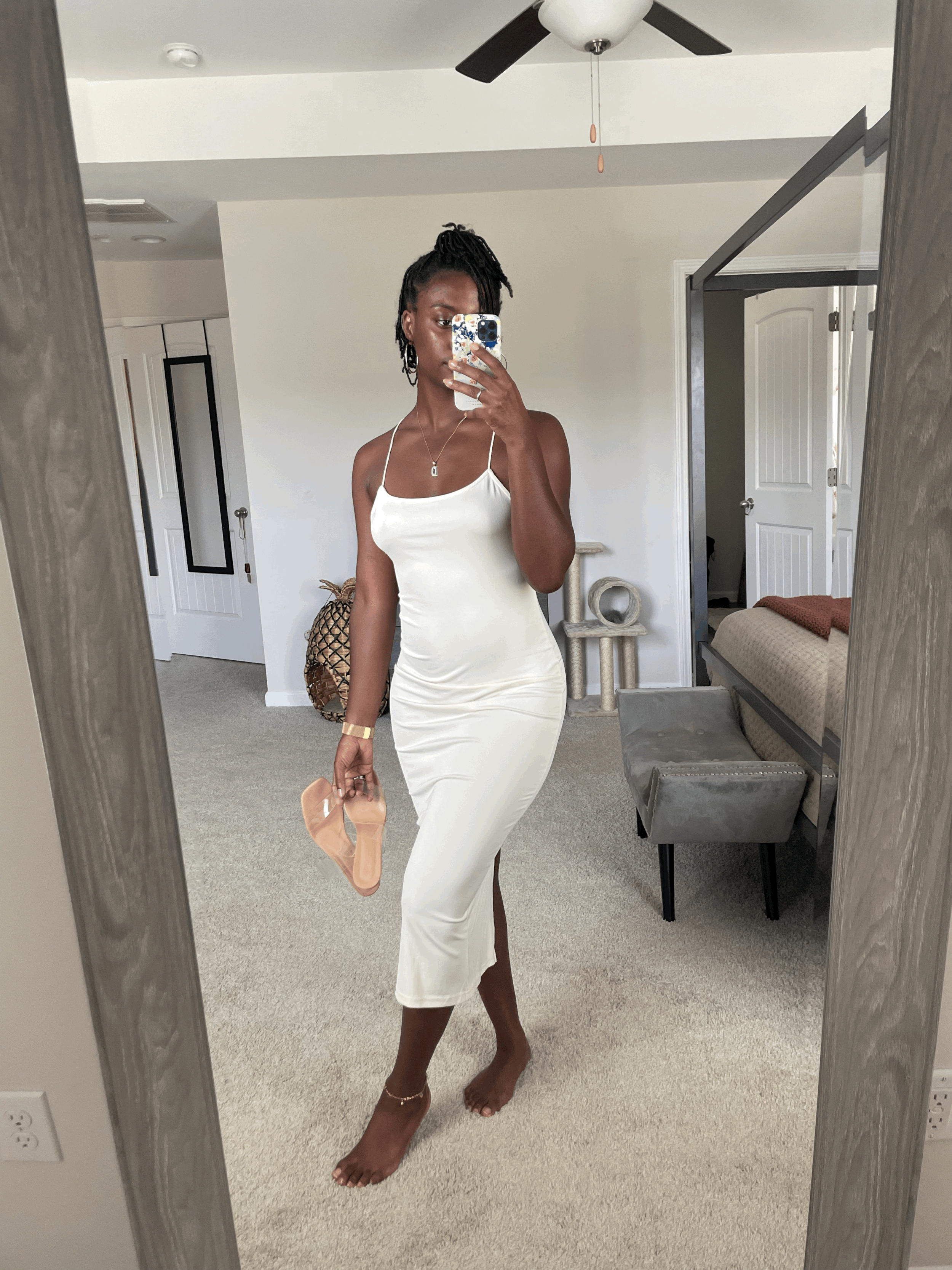 I’m declaring this nude midi dress as the dress of the summer. It’s the casual dress. The run some errands dress. The sexy dress. The day party dress. The dress you need to throw in your suitcase just because you know it’ll get worn at some point on your trip. With that, you can only imagine the possibilities you have for styling. Heels, mules, sandals. A pop of color. Straight earth tones. Simple jewelry. Flashy jewelry. I guarantee you have something in your closet right now that would look good with it.