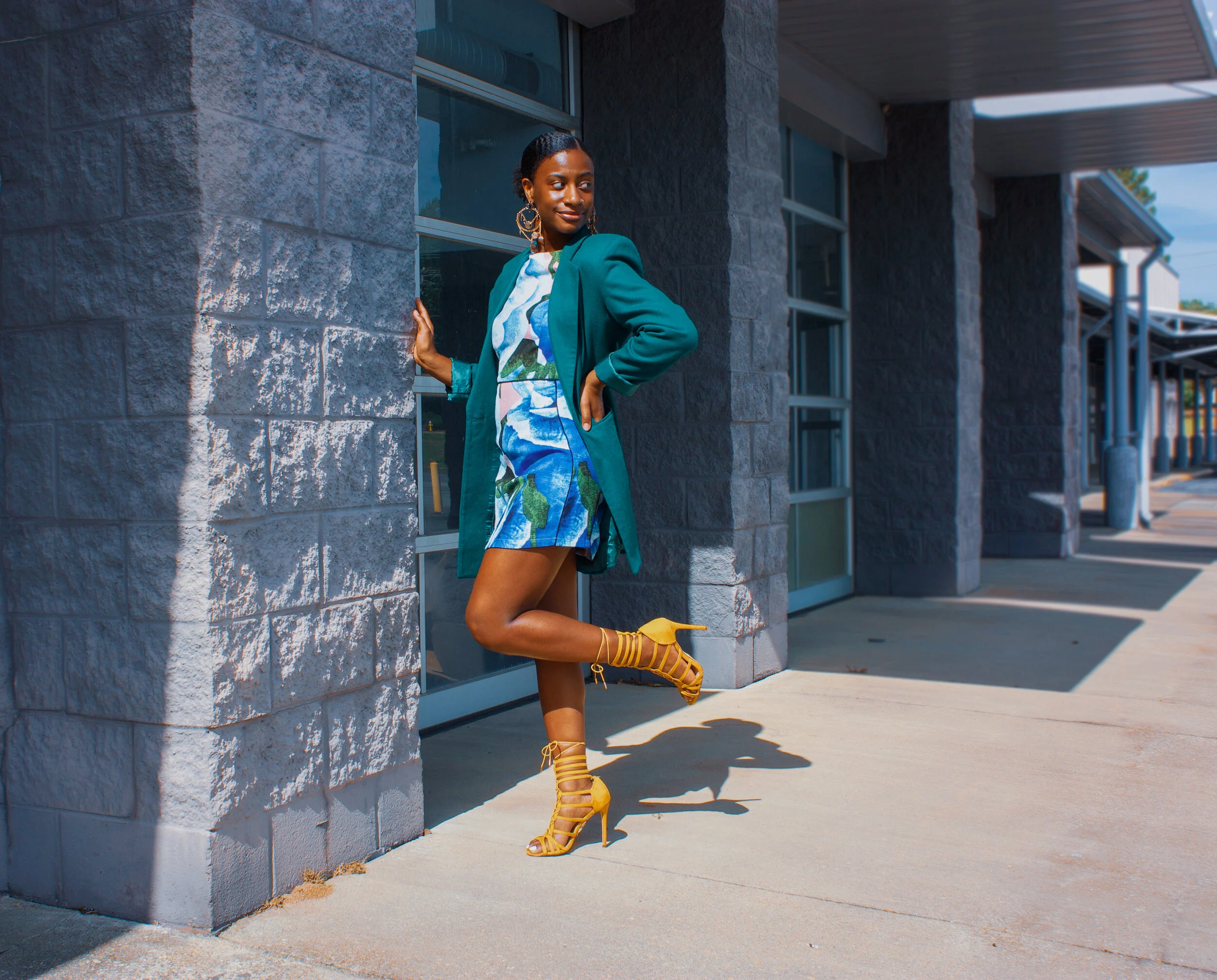 I’m a black woman that loves color, especially the way it complements my complexion. With that being said, I use it to my advantage quite a bit when putting looks together. This dress is colorful on it’s own, hence why I bought it, but I still felt like I needed more from it. It’s predominantly blue which is why I wouldn’t layer it with more blue; I always aim to bring out the more subtle colors in a dress which in this case would be pink or green. Though the shades of green in the dress are different from that of the blazer, I still felt it would be a great piece to complement each color. I had the same thought process when I decided on wearing these mustard yellow heels as well. They were for sure a nice contrast against the blazer, but even if I decided to take it off, I’d still feel confident that they would complement the colors in the dress.